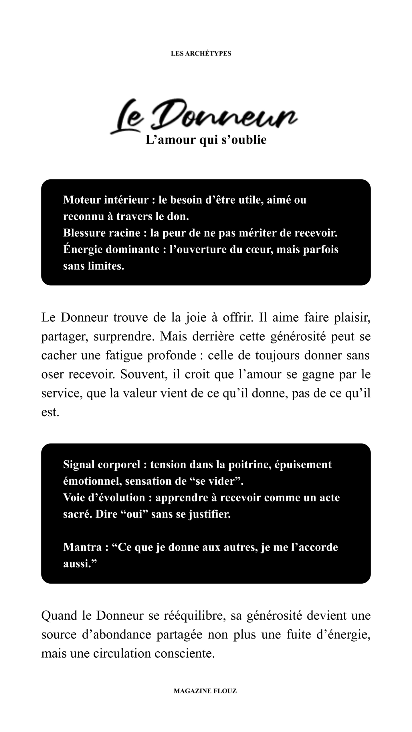 Nous portons souvent un peu de chacun de ces archétypes, selon les moments et les contextes. L’enjeu n’est pas de devenir “parfait”, mais de retrouver l’équilibre : donner sans se vider, recevoir sans se justifier.